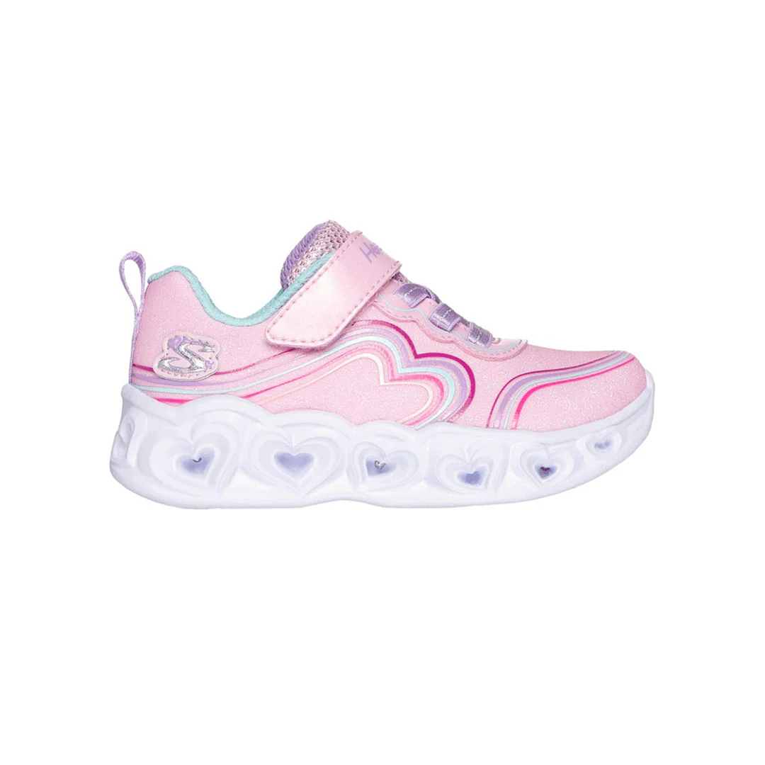 Brilla y resplandece con un deleite mágico con las Skechers Heart Lights® Infinite Heart Lights – Retro Hearts. Este diseño iluminado presenta una parte superior de malla brillante con un estampado de corazón de arcoíris en 3D, cordones elásticos, Skechers Adaptive Closure para un ajuste personalizado y una entresuela esculpida con luz y detalle de «cadena con forma de corazón».