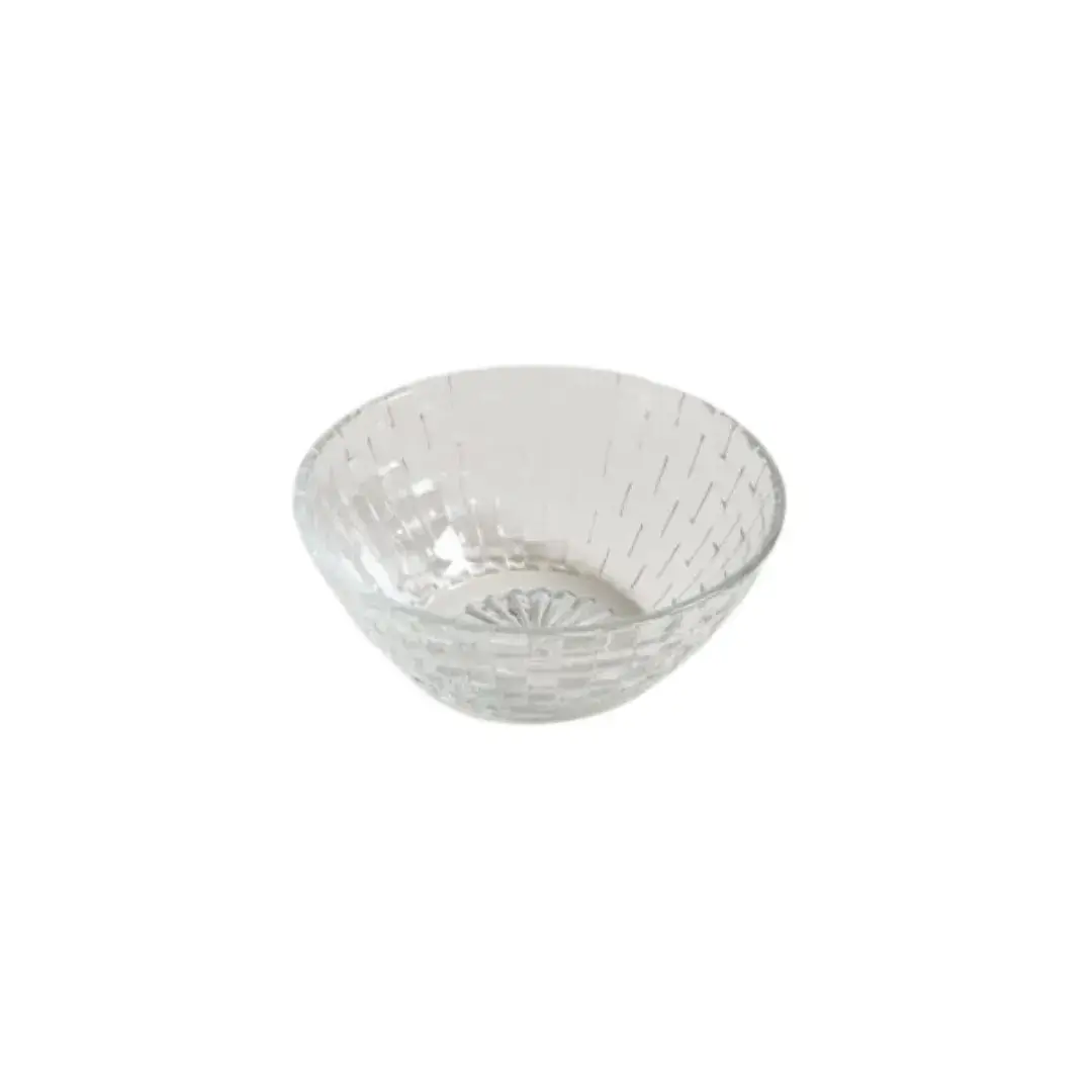 Bowl de vidrio con diseño de ratán, ideal para servir snacks y postres. Tamaño de 13×5 cm. Elegancia y funcionalidad en un solo producto.