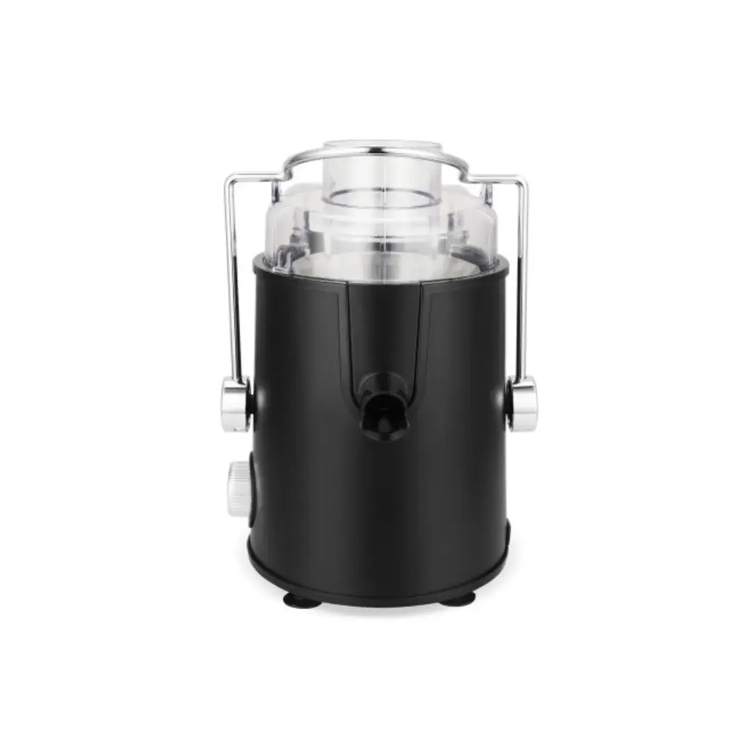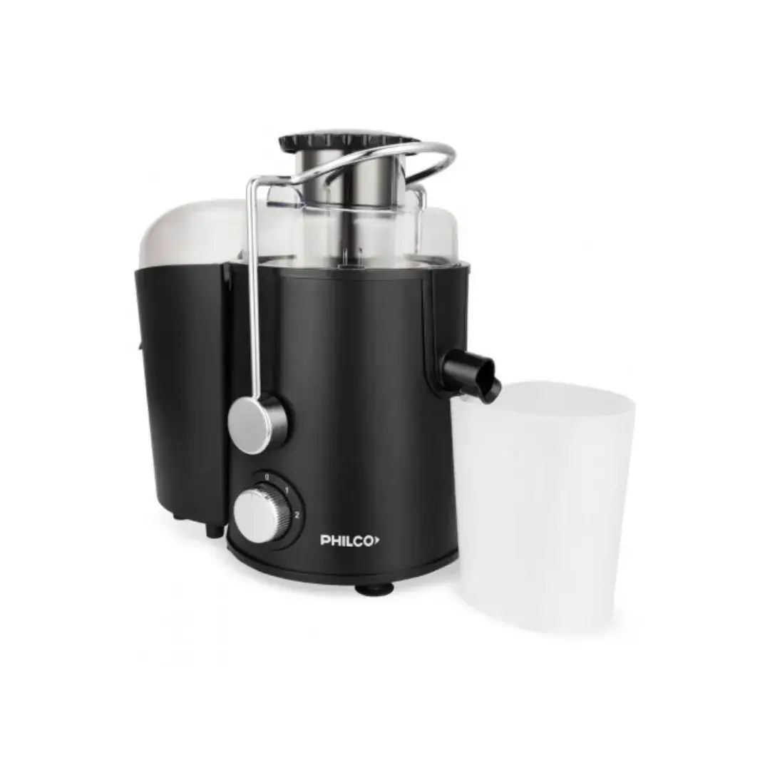 Juguera Philco Negra 400W, 2 velocidades, hoja y filtro de acero inoxidable. Perfecta para jugos frescos y saludables con diseño moderno y eficiente.