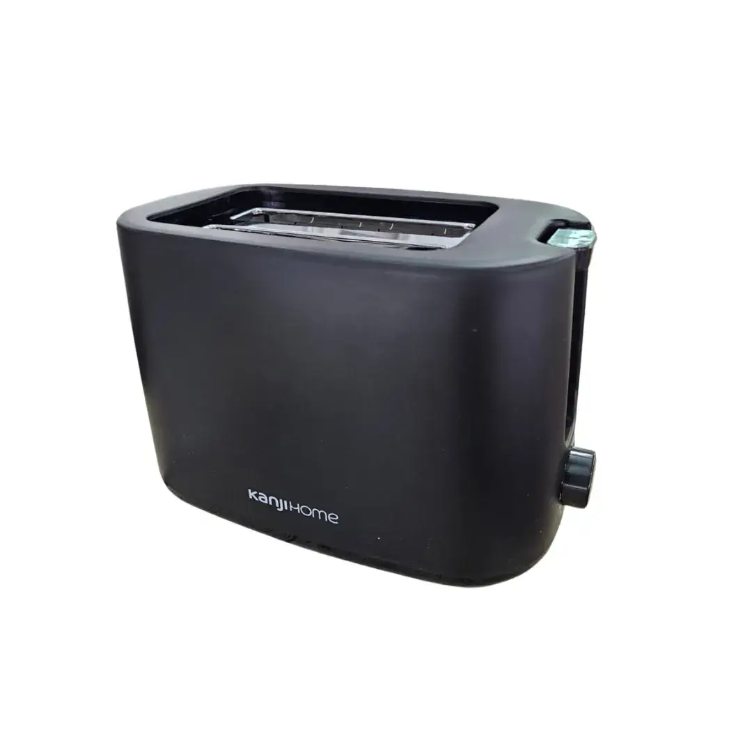 Tostadora KanjiHome negra KJH-TM800-05. Diseño moderno con ranuras anchas, múltiples niveles de tostado y función de cancelación para un desayuno perfecto.